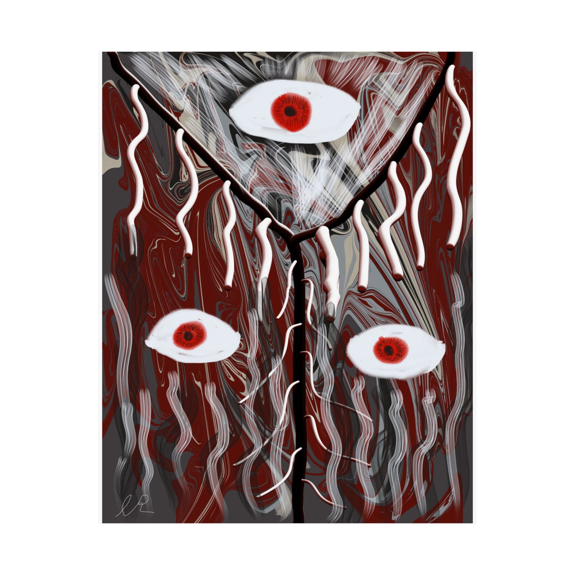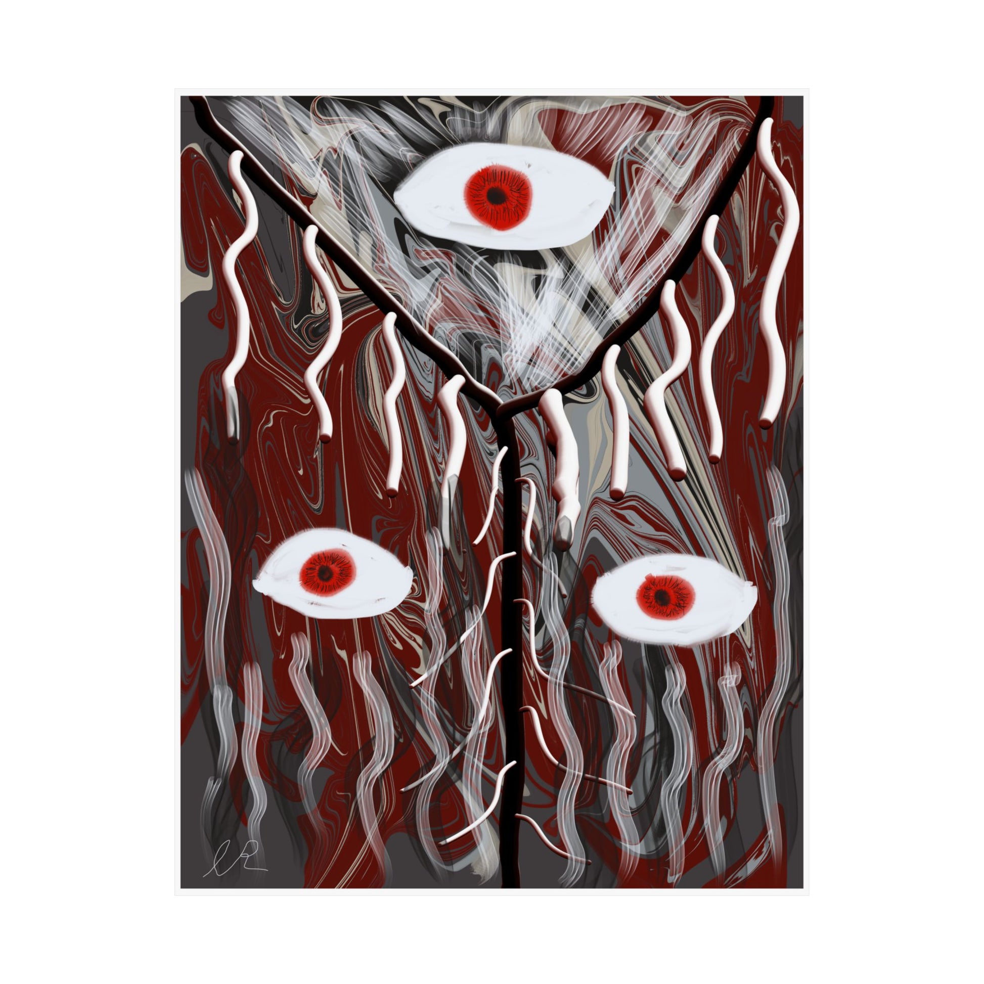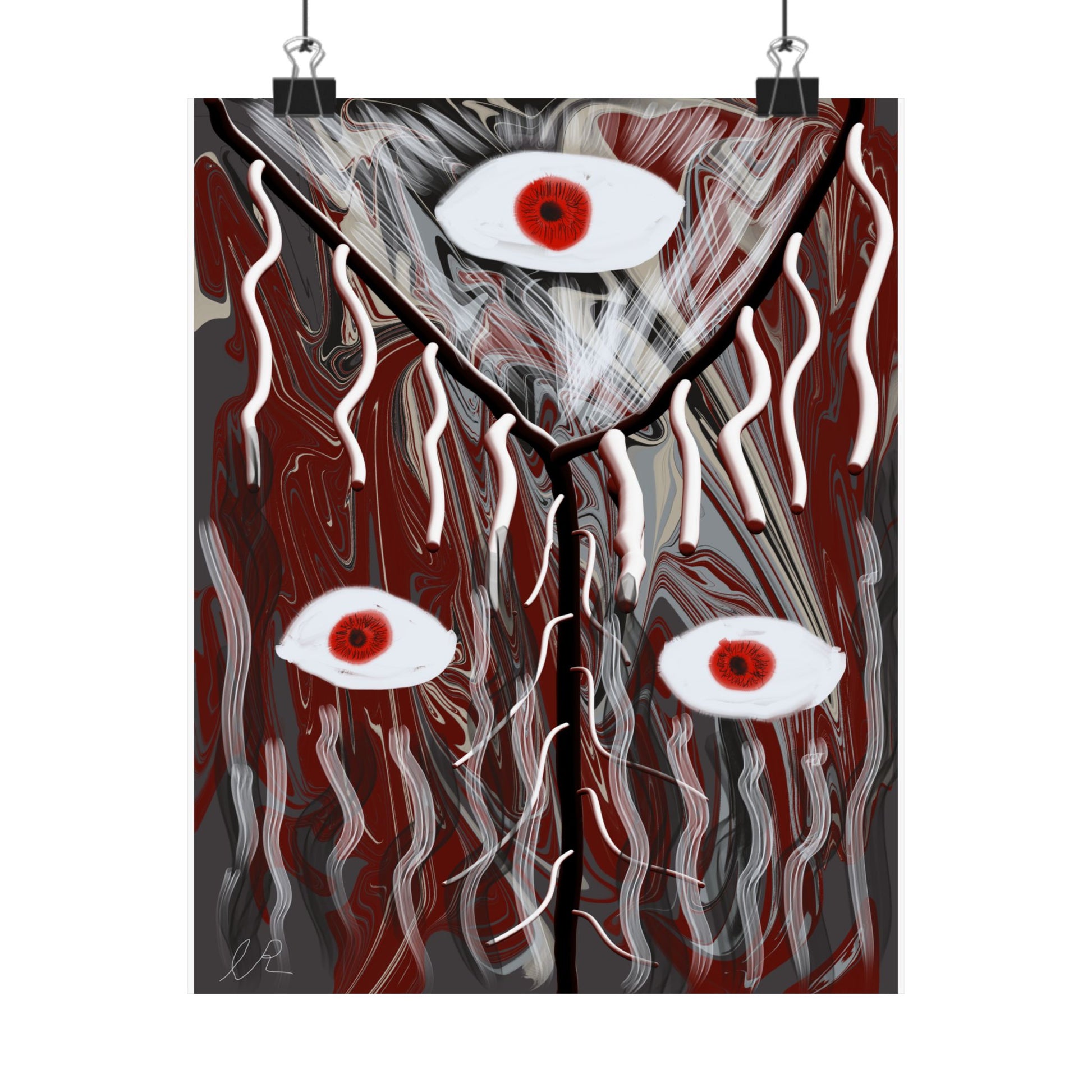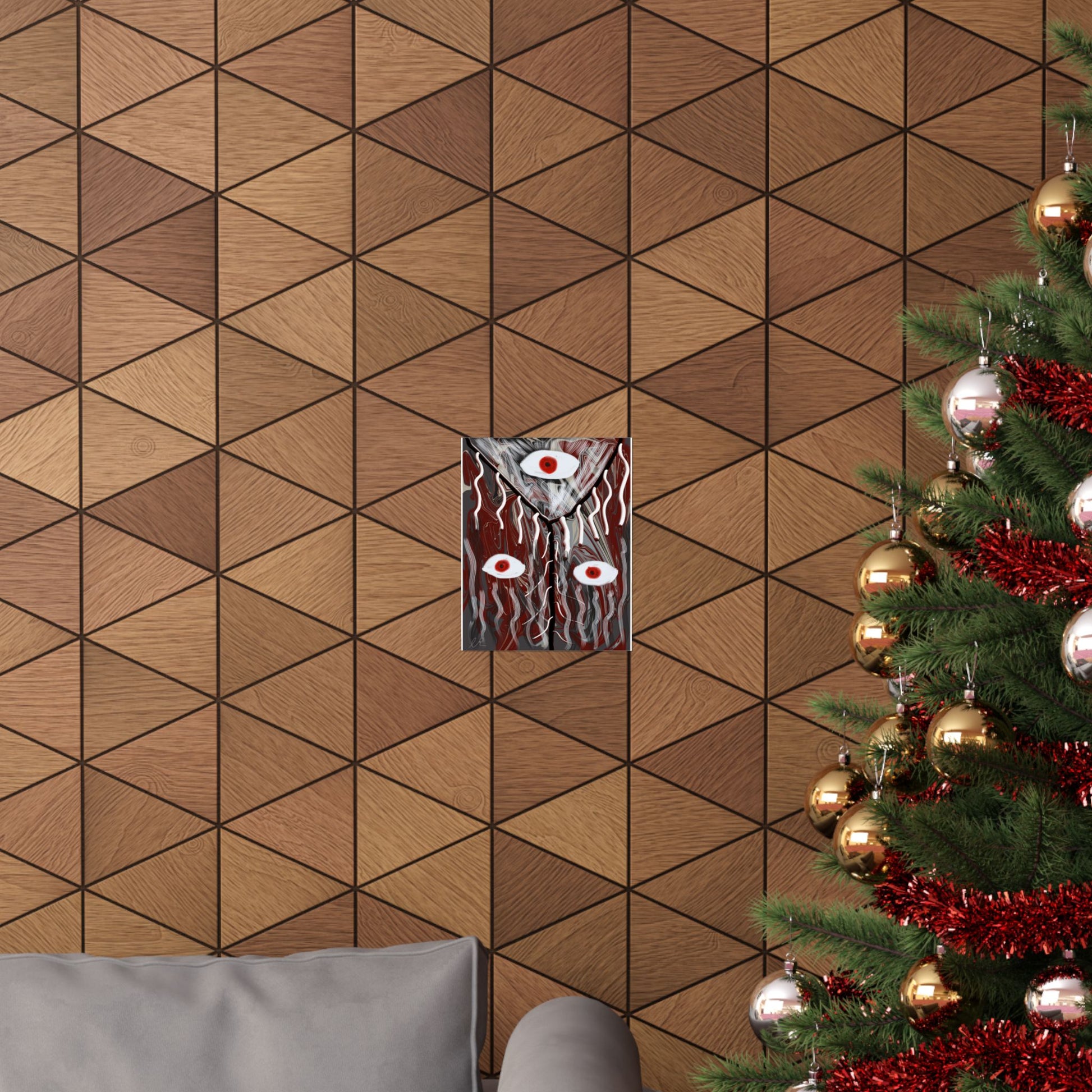 This matte vertical poster brings a dark, visceral energy into a room. Three stark, red-centered eyes float against a churn of deep burgundy, black, and ash-gray brushstrokes. The matte finish soaks up light, giving the layered strokes and scratchy highlights a tactile, hand-painted presence. Hang it where mood and mystery matter: above a reading nook, in a creative studio, or as a bold focal point in a modern living room. It leans into uneasy beauty — a conversation starter for people who collect art that feels alive and a little uncanny.